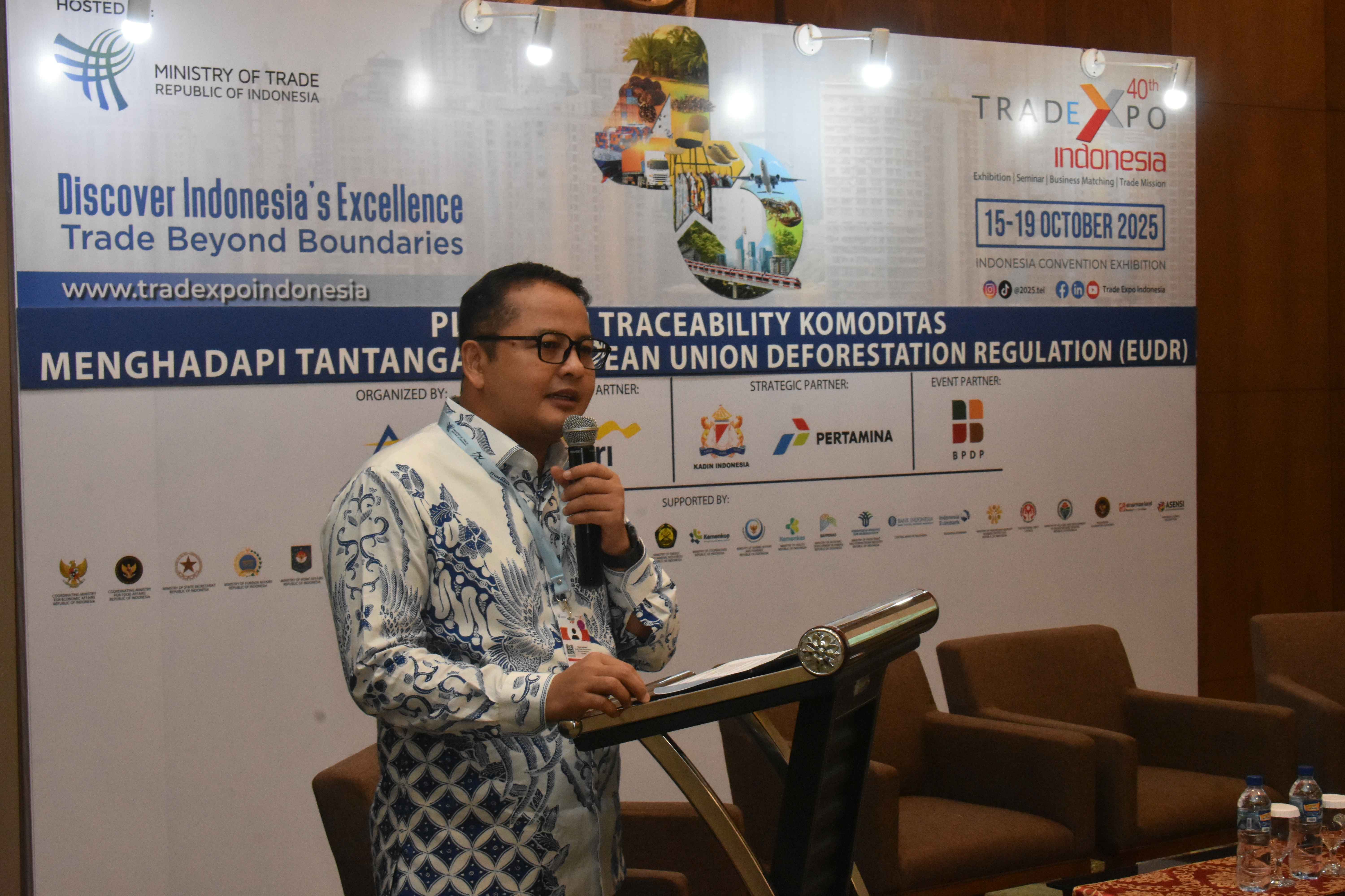 Direktorat Jenderal Perdagangan Luar Negeri menggelar forum diskusi bertajuk “Platform Traceability Komoditas Menghadapi Tantangan European Union Deforestation Regulation (EUDR)” pada Kamis, (16/10). Forum tersebut merupakan bagian dari Trade Expo Indonesia (TEI) ke-40 di Indonesia Convention Exhibition (ICE) BSD City, Kabupaten Tangerang, Banten. Pelaksana Tugas (Plt.) Direktur Jenderal Perdagangan Luar Negeri Kemendag Tommy Andana mengatakan, komoditas unggulan Indonesia seperti kopi, karet, sawit, dan kayu menjadi perhatian utama dalam penerapan EUDR. Namun, tantangan regulasi ini juga menjadi peluang strategis bagi Indonesia untuk membangun sistem keterlacakan (traceability) nasional melalui kolaborasi lintas sektor. Forum ini dimoderatori Kepala Pusat Data dan Sistem Informasi Kemendag Nurimansyah. Kegiatan tersebut menghadirkan empat narasumber dari kementerian, surveyor, eksportir, dan koperasi. Perencana Ahli Utama di Kedeputian Bidang Ekonomi dan Transformasi Digital Kementerian Perencanaan Pembangunan Nasional (PPN)/Bappenas, Hedi Idris, memaparkan, pengembangan sistem traceability yang selaras dengan ketentuan EUDR merupakan langkah strategis yang berpotensi mendorong pertumbuhan ekonomi nasional, khususnya di sektor komoditas unggulan.